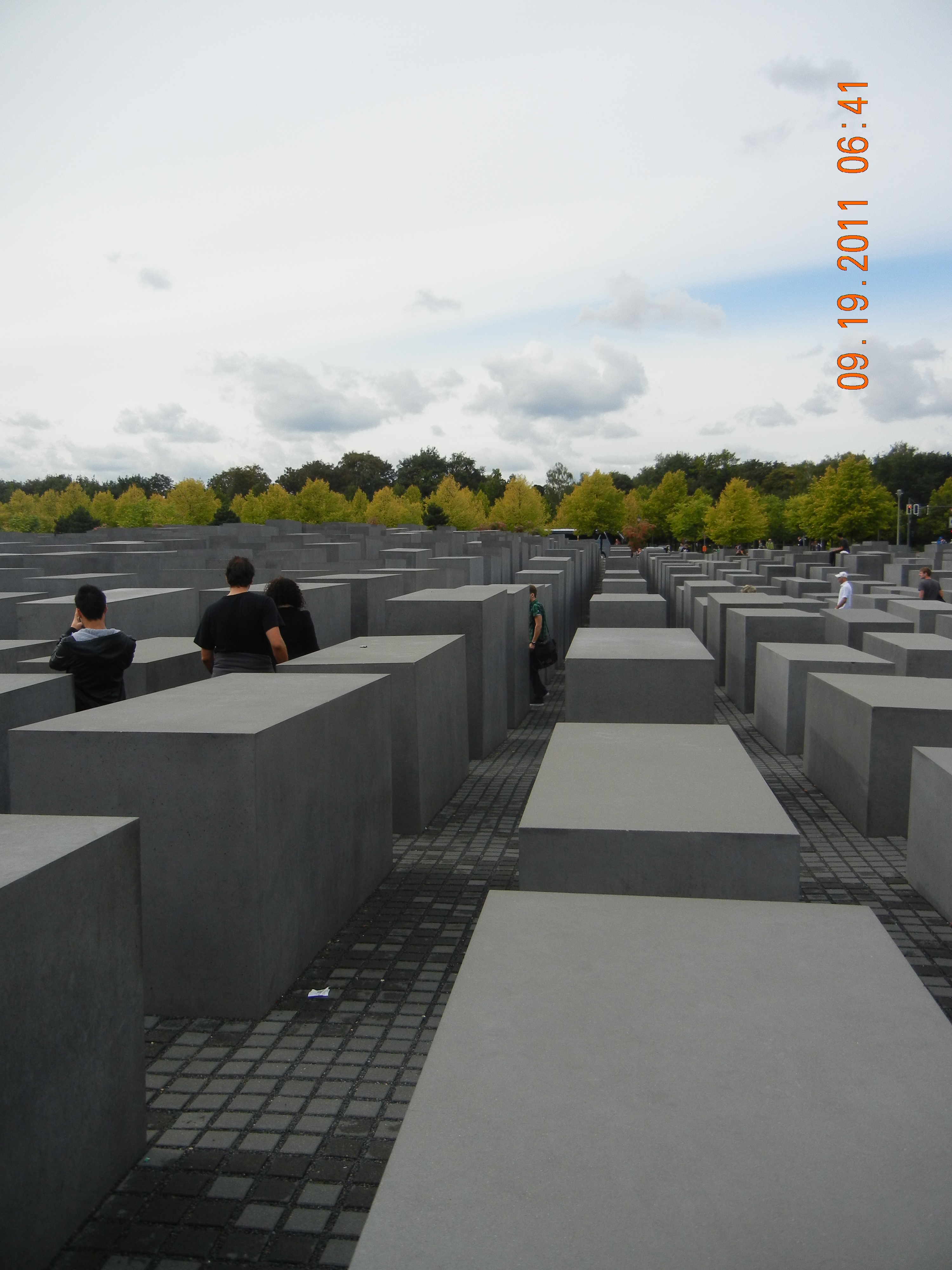 We walked around the Zoo Station area and I was amazed at how much had changed since I was there back in 1993 for the high school tour. We met our tour guide, our other 3 Americans and a few others who were going on the 3.5 hour tour with us. Then we proceeded to get right back on the u-Bahn and head right back to the Brandenburg Gate. (Earl was going to laugh if we ended up right back at the Stadtmitte station where we started from). We didn’t get to see much of the Brandenburg Gate, since there were some Turkish dignitaries visiting, so we went to our first stop, which was the Memorial for the Murdered Jews of Europe. It was definitely a memorial that is more complex than it seems at first and very disorienting as you walk through.