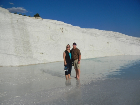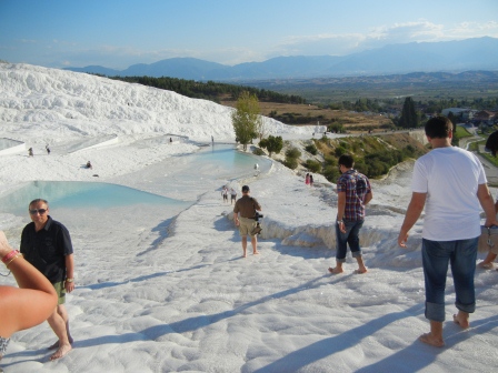 Once we got to Pamukkale, we parked and went up to the entrance we saw, got our ticket and took off our shoes. Luckily, my Scottevest travel vest has a key fob holder that I used to attach my shoes to my jacket. Earl tied his shoes to his belt. We then walked up the travertines to the top.