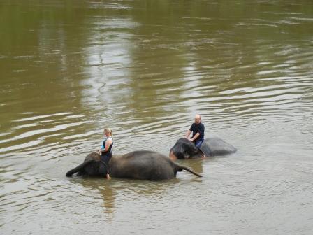 After I changed into my awfully not flattering bathing suit, we rode new elephants down to the river. I was totally unprepared for the elephants diving completely under water, but they can swim, who knew? So, we washed the elephants in the river and Earl actually got a chance to stand up on the elephant while it was in the water. His elephant had a lot of fun with him and even sprayed him with water from his trunk at the end of this ride. At this point, I was really tired and glad to get a Sprite before we went to feed the elephants.